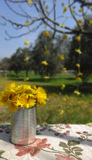 Comparto la siguiente decoración, al estilo primaveral, que he arreglado con flores amarillas para un pasar una tarde al aire libre,